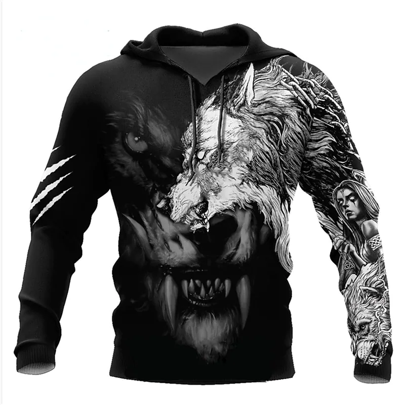 Męska bluza z kapturem z grafiką wilka i kieszenią na przodzie