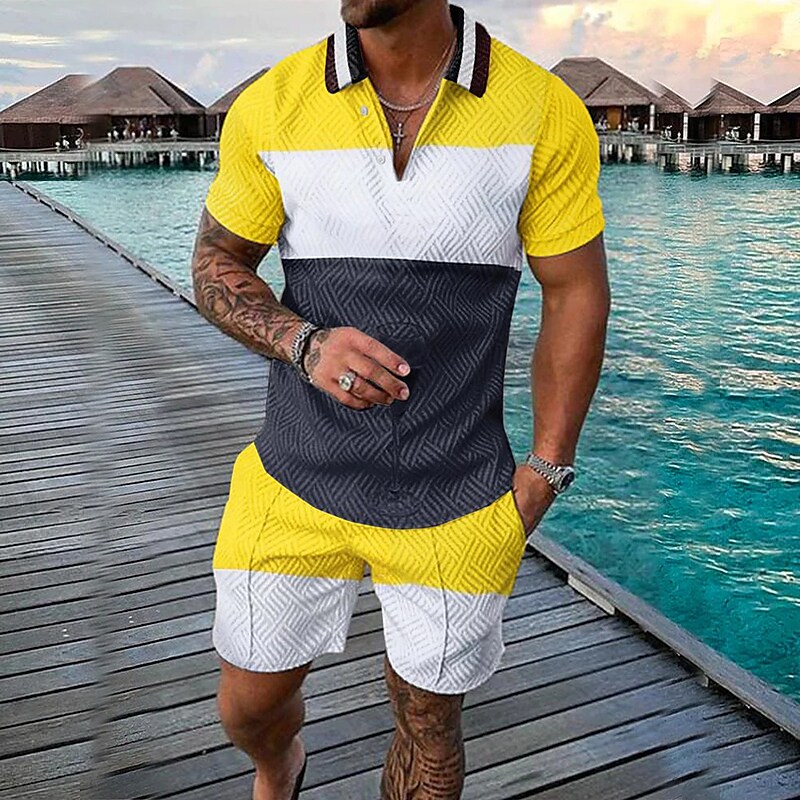 Men's 3D Print Color Block Zipper Casual Short Sleeve Polo Shirt Two-piece Set