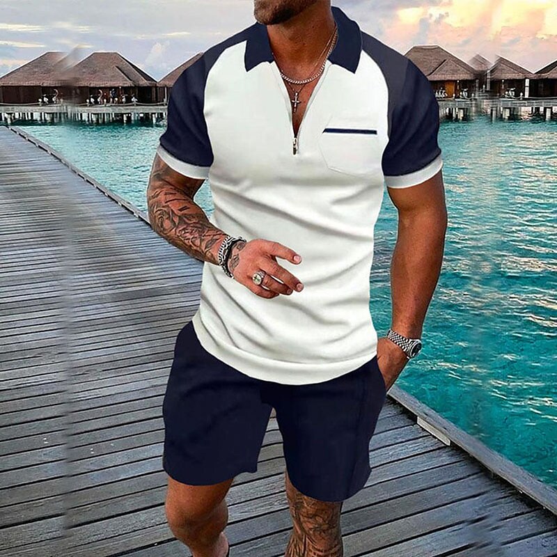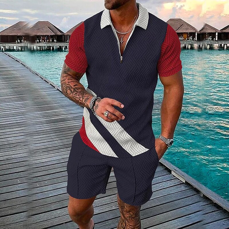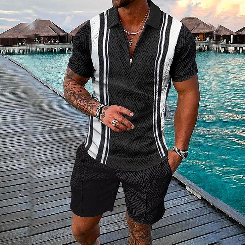 Men's 3D Print Zipper Casual Short Sleeve Polo Shirt Two-piece Set