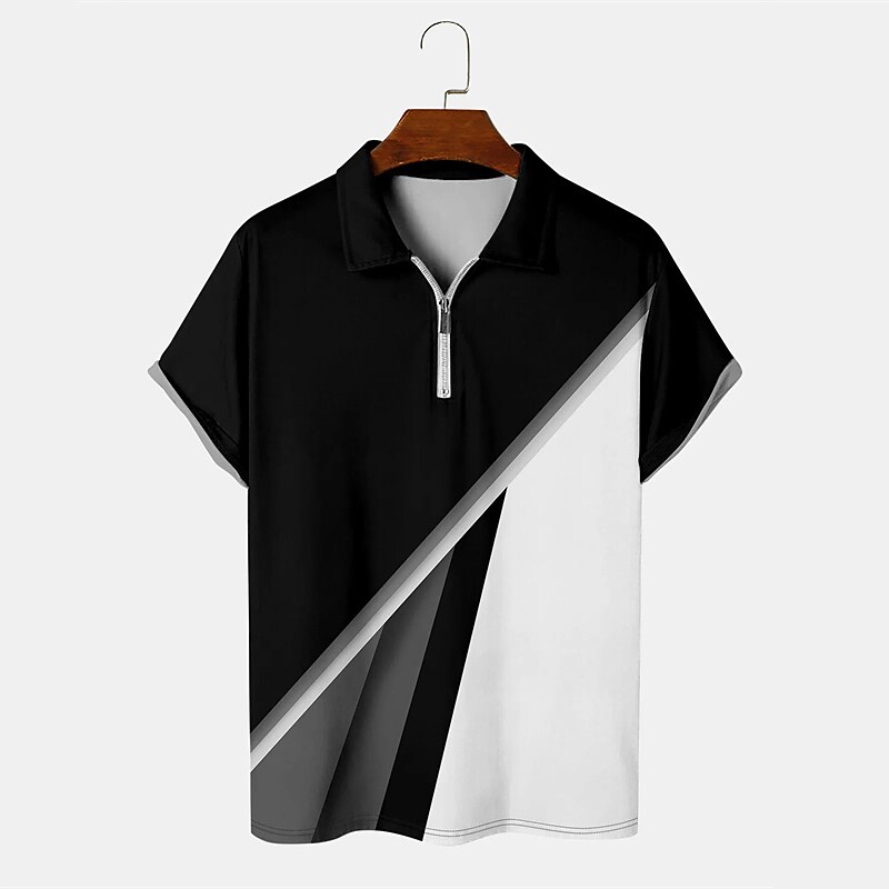 Men's Print Color Block Zipper Short Sleeve Polo T-shirt